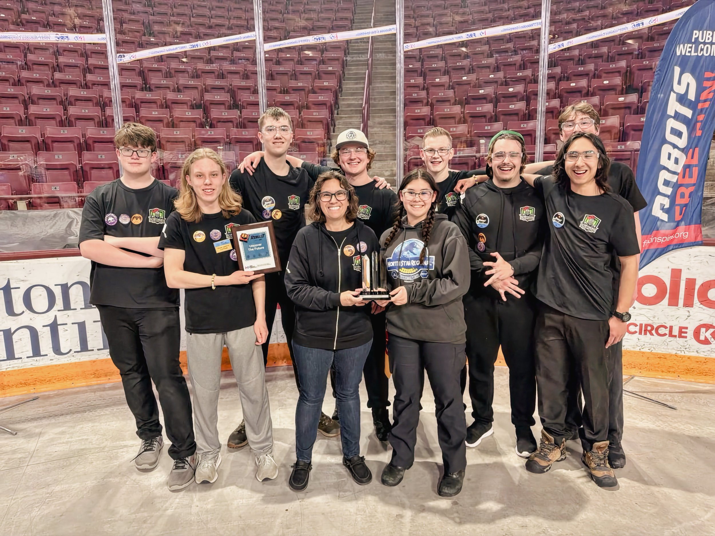 We arrived in Minnesota on Tuesday, April 2, and hit the ground running, testing and looking at the field. Our team ended up pivoting our robot strategy due to complications and became a defense robot that was able to aid our alliance partners, with whom we are paired in every match, to win. We were chosen to be part of the number one alliance by Team 2052, Knight Krawlers, in the semifinal and final matches. This allowed us to be part of the winning alliance and win the entire regional competition.