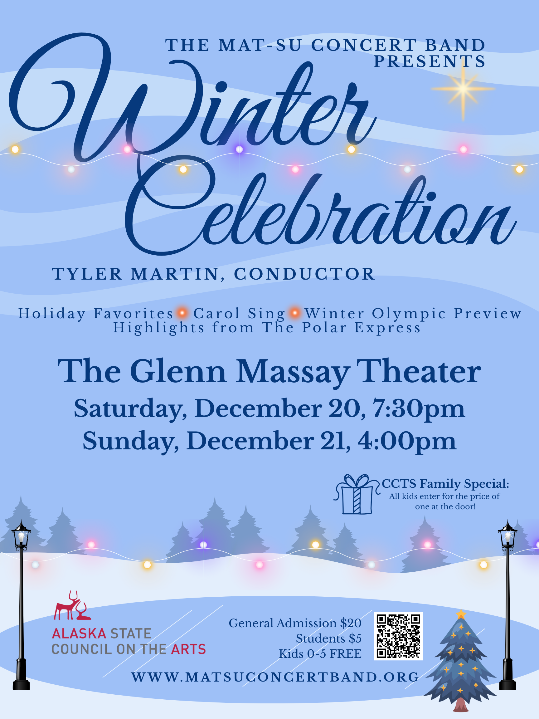 The “Winter Celebration” concerts take place at the Glenn Massay Theater at Mat-Su College at 7:30 p.m. on Saturday, Dec. 20 and 4 p.m. Sunday, Dec. 21. Ticket prices are $20 for adults, $5 for students, and free for children 5 and under. Tickets are available at matsuconcertband.org and at the door.