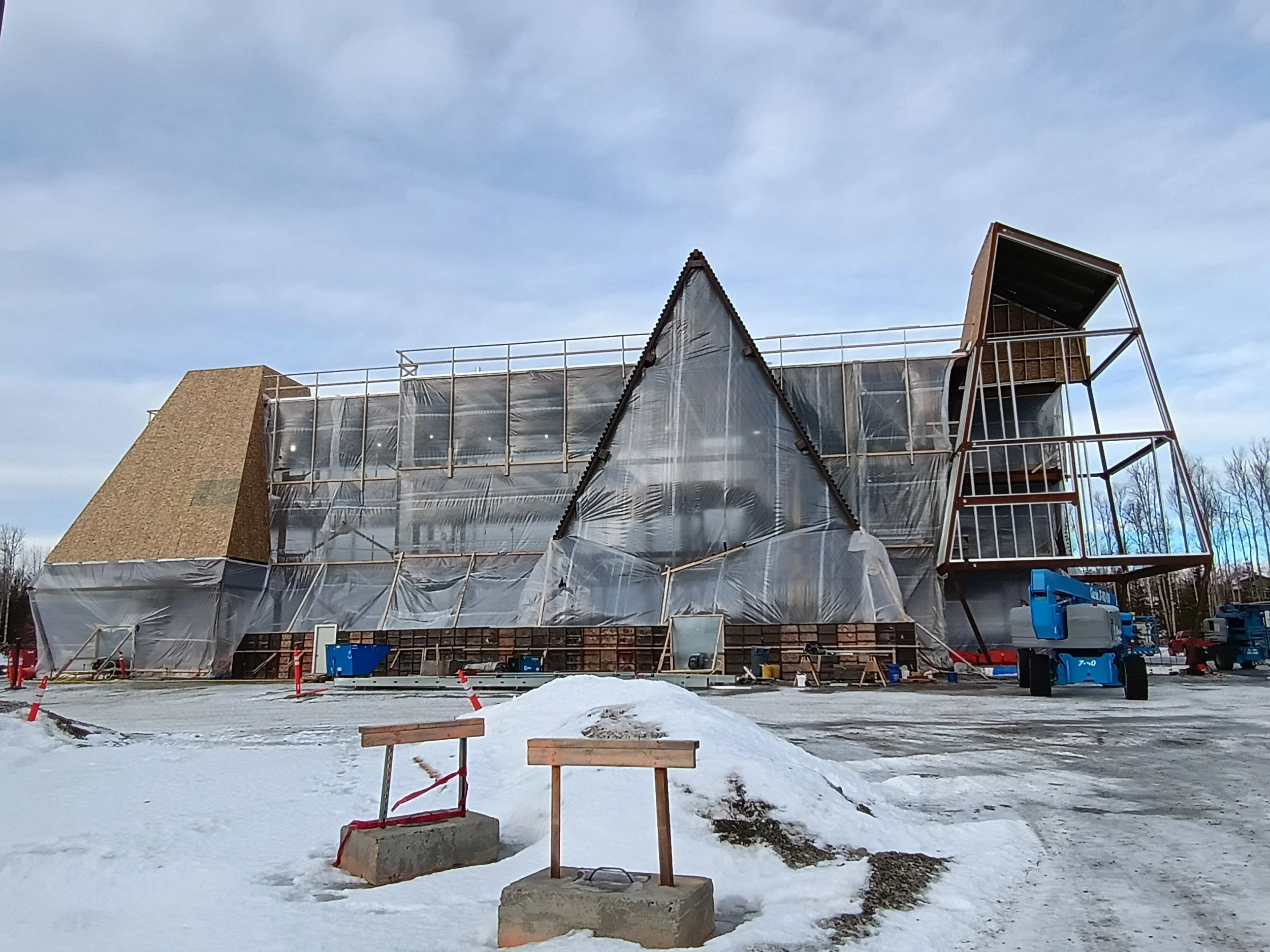Thanks to the dedication and professionalism of the Watterson Construction team and partners, work continued safely and consistently through wind, snow, and cold. From steel framing and decking to interior structural elements, the building is coming together beautifully and with great care. A MY House youth-led design echoes the shape of local mountains and welcomes the community with a familiar A-frame entry. The design, by Colony graduate Wil Carson and his company 64 North Architects, is unique, bold, and beautiful.