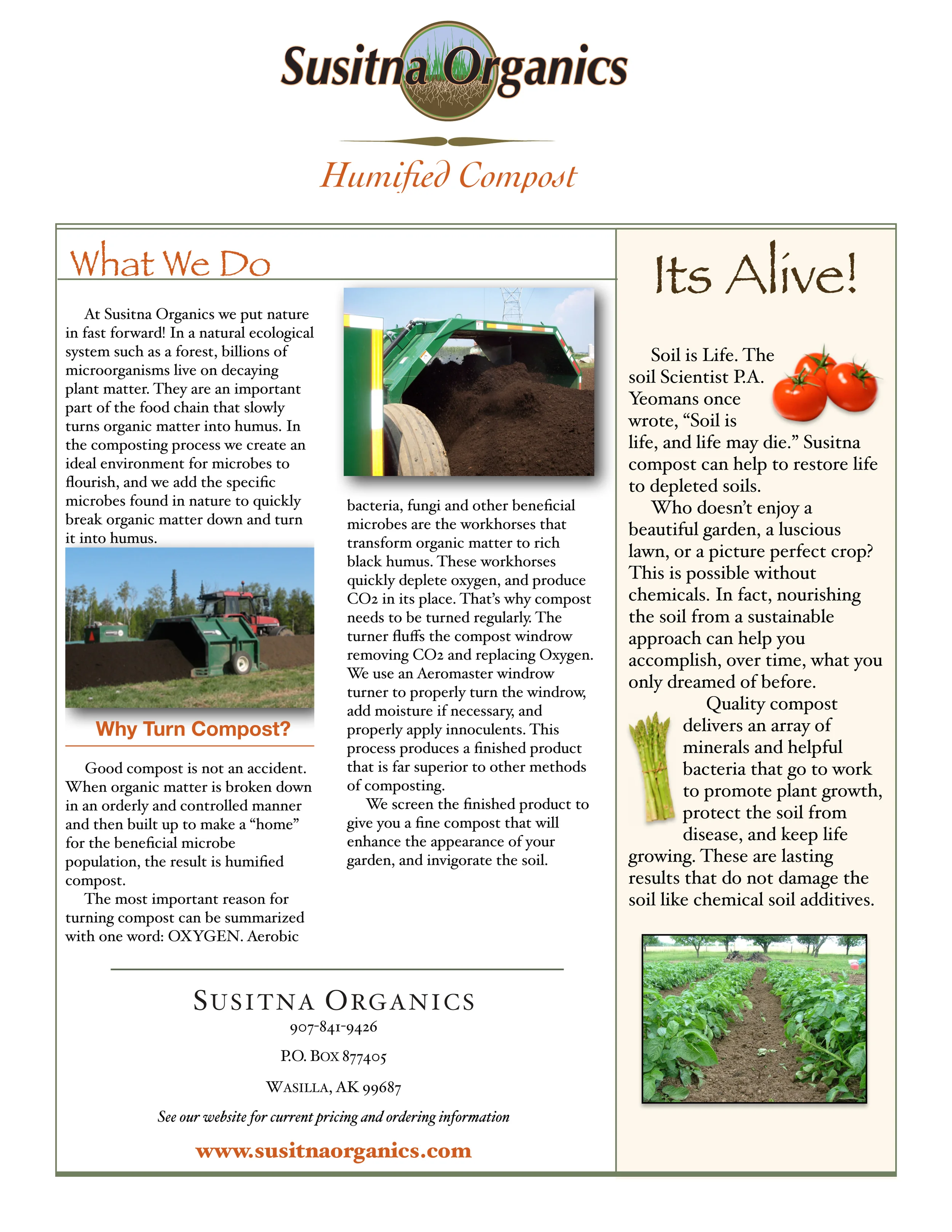 Susitna Organics Humified Compost has been reviewed and registered with the Washington State Department of Agriculture Organic Program for use in organic production. That means that certified organic farmers in Alaska can use this soil amendment in their soil fertility program. The product is called “humified compost” because it is not only completely broken down, but also has high levels of humus.