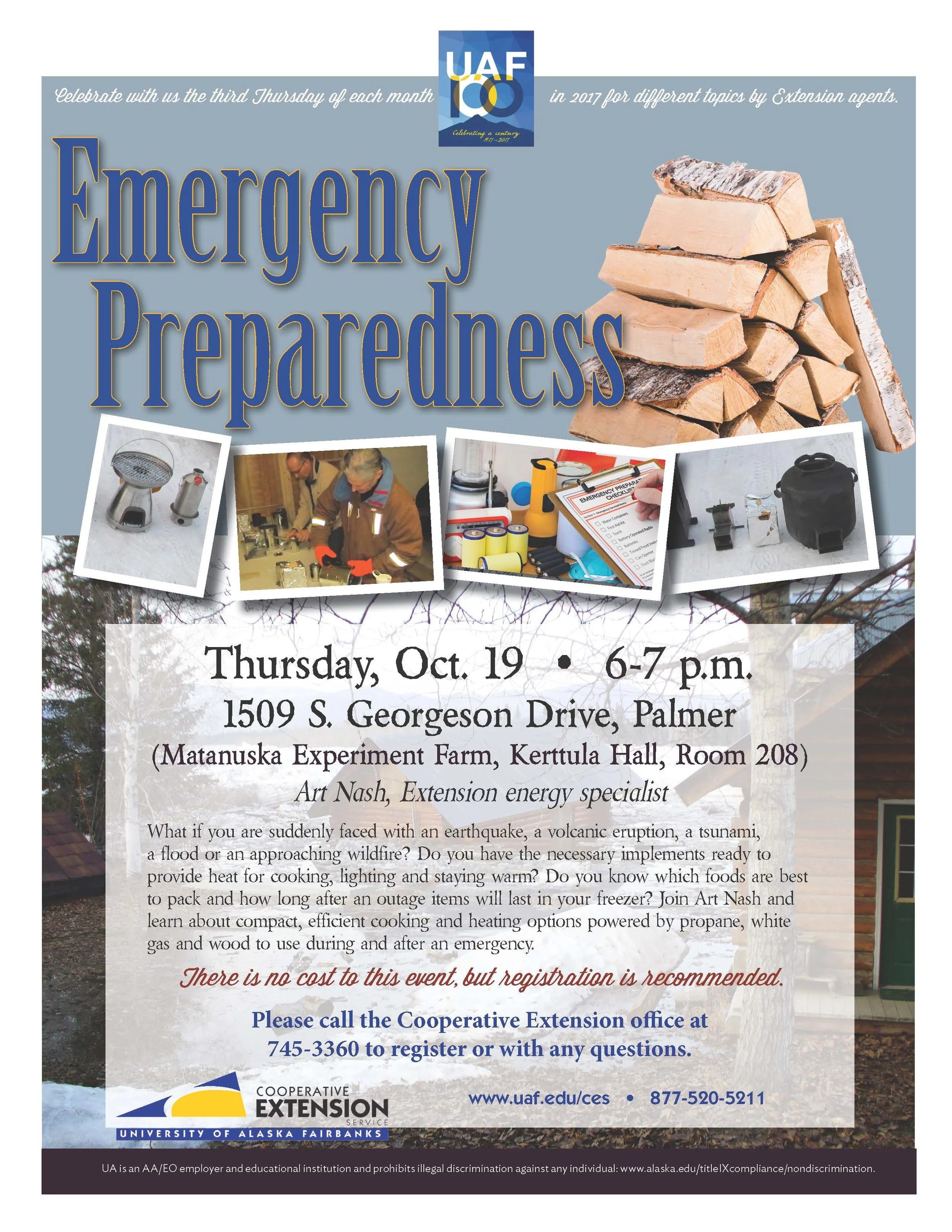Not sure where to start or how to prepare? No problem! The UAF Cooperative Extension Service is offering an Emergency Preparedness Workshop at the Matanuska Experiment Farm. Join Art Nash, UAF’s energy specialist, as he shares practical tips and ideas and offers economical ways to prepare for just about any emergency scenario. This class is a part of our UAF Centennial Celebration Series, and will be held October 19th at 6pm and is free of charge to the public.