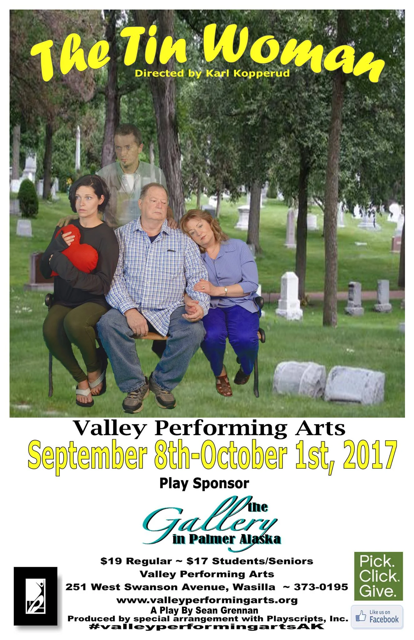 The Tin Woman opened September 8th and runs through October 1st. Ticket prices are $19 for regular admission, $17 for seniors/students. This heart-warming comedy/drama will be appearing at Valley Performing Arts, 251 W. Swanson Avenue, Wasilla.